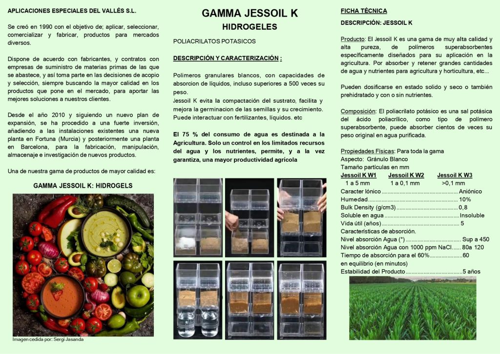 – ¿Qué es? JESSOIL K son polímeros granulares blancos, con capacidades de absorción de líquidos, incluso superiores a 500 veces su peso