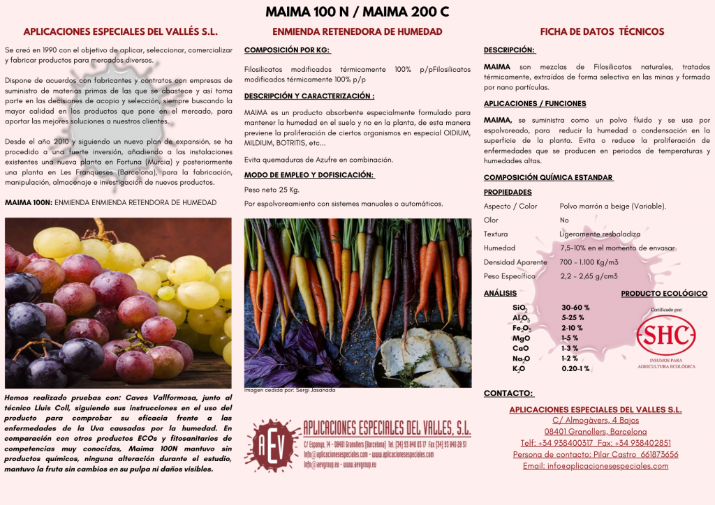 MAIMA es un producto absorbente especialmente formulado para mantener la humedad en el suelo y no en la planta, de esta manera previene la proliferación de ciertos organismos en especial OIDIUM, MILDIUM, BOTRITIS, etc…